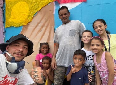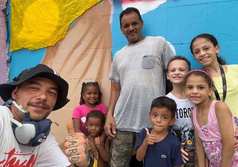 Red hearts and messages of love, the street art of Artist =AIMSA= invites passers-by to smile across the world and show that love and mutual aid have no borders.